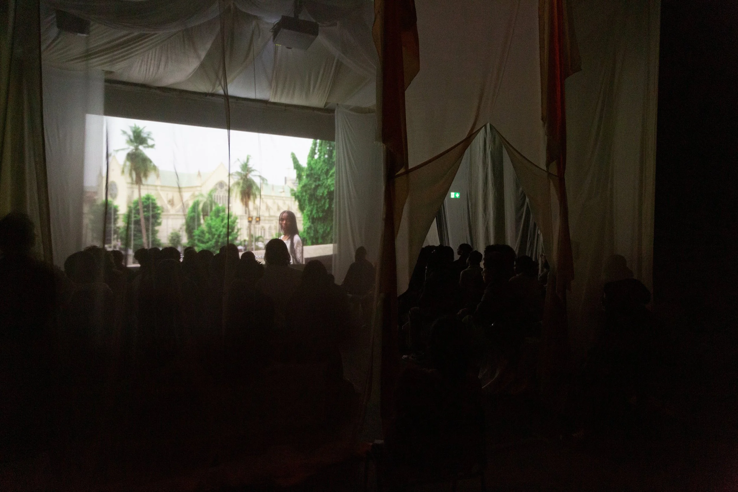 Guardian Angel on view at the ICA’s Image Behaviour - an annual convening dedicated to experiments in artists’ moving image. Using draped silks and textiles, the screening space was transformed to resemble a chapel, hosting audience members within the structure.